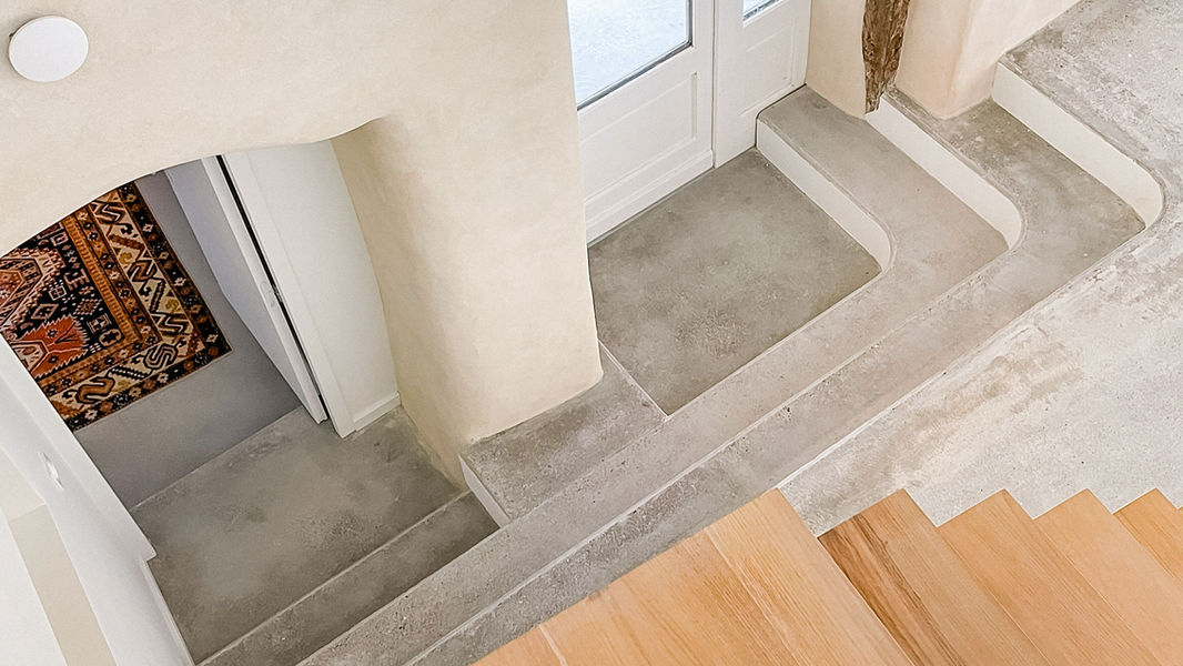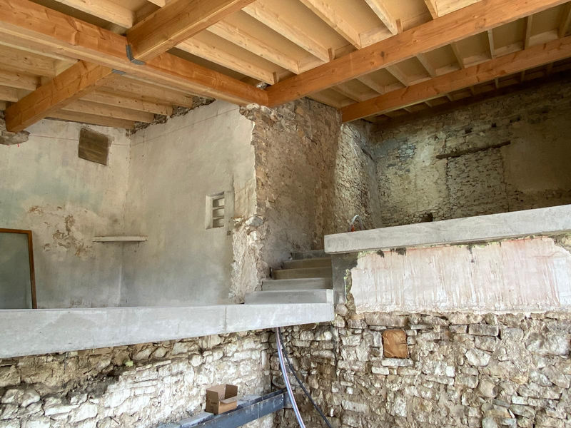 Transformation des granges et caves d'une maison du XVIIème siècle en habitation, dans la Drôme (26). Désimperméabilisation de la cour, travail avec des matériaux locaux, laissés bruts (menuiseries en châtaignier et chêne, enduits en terre et chaux.